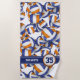 This volleyballs pattern beach towel features a random pattern of varied size blue, orange and white stylised volleyballs turned every which way - her name and jersey number are customisable - by katz_d_zynes