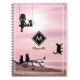Keep track of your busy schedule with this customised notebook! Cover: At the very centre, white against black, lies the first letter of your name (in capitals) inside a diamond shaped frame. Under it goes your first name, in black, in cursive letters. Against the background of a rose tinted beach stand three silhouettes: A girl and her kitten on a swing with a tiny flower between them at the top left; a cat taking a stroll around the white line framing the cover; and a cat couple enjoying each other's company on a tree branch at the bottom left. Please notice that by clicking to customise further you can resize and replace all the icons as well as change their fill colours (that is set by default as black).