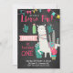 Cute girl's chalkboard llama fun birthday invitation featuring a llama, cactus, bunting flags and pink banner. This is a cute and colorful way to invite your little girls guests to her birthday party.