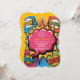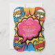 A vibrant pop art style invitation design featuring a large pink speech bubble prominently placed in the center against a white background. The speech bubble has a glossy, cartoon-like appearance with a bold black outline and small circular highlights, ready to contain party details or messages. Surrounding the central bubble, colorful pop art elements burst with energy including comic book-style "POW!" and "BOOM!" text effects, rainbow starbursts, polka dot patterns, and lightning bolt shapes in bright primary colors of red, blue, yellow, and green. The overall design captures the playful, high-energy aesthetic of 1960s pop art with bold outlines, Ben-Day dot patterns, and a cheerful color palette perfect for a children's celebration.