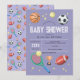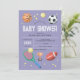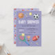 This cute and modern girls baby shower invitation design features a purple sports cartoon pattern, with a basketball, football, soccer ball, tennis racket, trophy, and stars. The invite can be personalised with the parent's names and other details necessary for your party. The perfect fun sports themed addition to your co-ed couples boys baby shower.