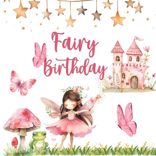 Fairy Tale Dream Birthday Invitation: Make your child's birthday a fairy tale come true with our enchanting invitations. The design showcases a charming string of stars, mushrooms with a frog, and a cute fairy with a magic wand, all set against a soft light pink background with a distant castle. Personalise the details to suit your event, and take advantage of the extra space on the back for a wish list or additional information. Perfect for any age, these invitations are sure to delight. Bring the magic to life – buy yours today!