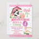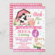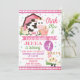 Cute girl's farm animals birthday invitation featuring five farm animals, a pink barn, balloon and pink banner. This is a cute to invite your little girl's guests to her farm themed birthday party. All text is editable.