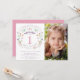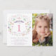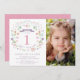 This elegant and pretty first birthday invitation features an illustrated floral wreath with the words "Let's Celebrate" encircling the number 1. The text colour, font, message, and photo can be changed to your liking. The back of the invite features a pink background (that can be swapped to any colour of your choice) with a white quatrefoil pattern. A perfect way to invite guests to celebrate a girl's special birthday.