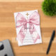 Blush pink watercolor coquette bow is decorated with roses and sage green greenery. A gold cross is placed above the text. The back is a chic pink and white stripe pattern. Your daughter's name is written in a beautiful calligraphy script. All text is editable.