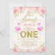 Sweet pink and purple flamingo first birthday invitation featuring two cute flamingos, pink floral arrangements and some faux gold glitter text. This girl's first birthday invitation is sure to set the scene for a flamingo themed first birthday party.