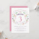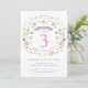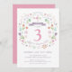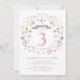 This elegant and pretty third birthday invitation features an illustrated floral wreath with the words "Let's Celebrate" encircling the number 3. The text colour, font, and message can be changed to your liking. The back of the invite features a pink background (that can be swapped to any colour of your choice) with a white quatrefoil pattern. A perfect way to invite guests to celebrate a girl's special birthday.