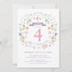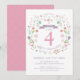 This elegant and pretty third birthday invitation features an illustrated floral wreath with the words "Let's Celebrate" encircling the number 4. The text colour, font, and message can be changed to your liking. The back of the invite features a pink background (that can be swapped to any colour of your choice) with a white quatrefoil pattern. A perfect way to invite guests to celebrate a girl's special birthday.