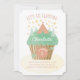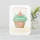 A sweet and chic birthday party invitation with a rustic touch for a "Glamping" themed party complete with a tent in a forest of trees under gold stars all on a birthday cupcake.