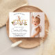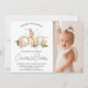 Sweet girls first birthday invitation featuring a gold word and pink colored flowers as well as little bunny in a bathtub illustration. Ideal for someone looking for a cute photo bunny themed first birthday invitation.