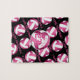 This volleyball pattern jigsaw puzzle for girls features a larger pink and white artsy, stylised volleyball, upon which her name and jersey number can be personalised, overlying a pattern of smaller pink and white volleyballs on a black background and "I love volleyball" varsity-letter-style text in pink stretching between the angled rows of volleyballs - by katz_d_zynes