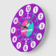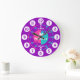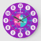 Colourful girls graphic wall clock colour coded to help assist your child to read a clock. This colourful teaching aid includes minutes and hours and past and to making child's play of telling the time. Clock colour coded in pink, purple, aqua and white featuring a little white butterfly and can be customised with your name of choice. Currently reads Rebecca. Designed exclusively by Sarah Trett. A great addition to a little girl's bedroom who is just learning to read a clock face.