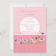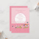 A fresh-looking invitation in shades of pink with a flower border. The border can be dragged to any location, made larger or smaller (+-) or eliminated. The background has pink on pink polka dots, a ribbon-hoop centre and a pink on pink check bottom. It's all overlaid with a white scalloped centre decal.