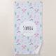 This modern kids beach towel design features a cute pink river axolotl pattern and can be personalised with your child’s name. The quirky gender-neutral pattern also includes flowers, river plants, and waves. The perfect salamander-themed towel for any water lover!