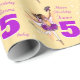 Birthday wrapping paper in a cute yellow, orange and purple dark haired ballerina dancing girl polka dot and star design. Personalise this girlie birthday paper with your own name and age. Currently reads Happy Birthday Tianna 5 today. Perfect for wrapping a special fifth birthday gift. Uniquely designed by Sarah Trett.