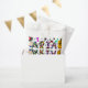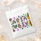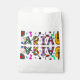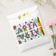 Birthday party favour bags with purple, pink, red, blue and teal flowers and musical symbols like guitar and musical notes.