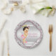 Angel baptism paper plates with adorable angel baby girl on a beautiful pink and silver swirl background. You can add the text of your choice to personalise these sweet baby girl baptism paper plates.