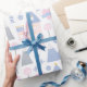 This pretty girls pastel wrapping paper features a a pattern with pink castles, lollipops, hearts, and blue mountains on a white background. It's the perfect wrapping paper for a baby shower gift or a child's birthday.