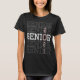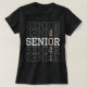 the front of this class of 2021 short sleeve grew neck t-shirt features a graphic that repeats "SENIOR" 5 times, with the centre boasting a white fill, and the other 4 simply outlines. within the "O"'s the year 2021 appears vertically in the colour PINK.