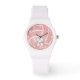 This sporty volleyball watch features a minimalist volleyball graphic (represented only by the volleyball's seams in white) overlying a pink, chic, digitally created texture - customise with her name and monogram or jersey number - by katz_d_zynes