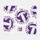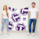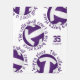 This sporty volleyball themed fleece blanket features 5 randomly arranged purple and white volleyballs with the text, "The volleyball court is my happy place" in purple encircling each volleyball in a fun typographic font, all on a white background - her name and jersey number are customizable - by katz_d_zynes