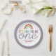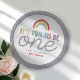 Celebrate turning one with these cute “It’s fun to be one” birthday paper plates! Featuring a modern retro rainbow, colorful font and space to add your child’s name on the front, plus a coordinating minimalist purple outline. Perfect for a 1st birthday party.
