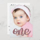 Minimalist Rose Gold Glitter First Birthday Invitation. Design features of simple one photograph with 'one' in trendy modern rose gold glitter. Add party details on the back.