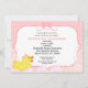 Cute rubber ducky baby shower invitation for girls with a yellow rubber ducky and a pink dot background. Design has pink bubbles and a cute duck with a pink and white bow. Customise with your shower details.