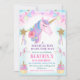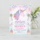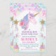 Any age girl's unicorn birthday invitation featuring a watercolor unicorn, bunting flags, stars, hearts, and unicorn cupcakes on a blue, white and pink background. This unicorn birthday invite is ideal for a unicorn birthday party.