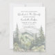 The front showcases watercolor artwork of dark pine trees, rolling hills, and majestic mountains in the background, creating a serene wilderness vibe. A subtle nod to a hiking trail is featured front and centre, tying the theme together. The clean white background at the top keeps the focus on your party details with a modern and elegant layout.