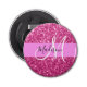Girly and glam hot pink glitter sparkles white monogram name and initial bottle opener. Your custom name and monogram are written in an elegant hand lettered script with a pink background. A perfect birthday or Christmas gift!