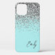 Girly Aqua Blue - Silver Faux Sparkle and Dripping Glitter Brushed Metal Monogram Name and Initial Phone. This makes the perfect sweet 16 birthday, wedding, bridal shower, anniversary, baby shower or bachelorette party gift for someone that loves glam luxury and chic styles.