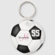 This sporty soccer keychain for girls features a traditional style soccer ball with black and white panels - customize with the player's name, monogram and jersey number - by katz_d_zynes