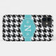 Black and white houndstooth pattern with a seafoam blue stylish quatrefoil triple monogram template. A modern and trendy gift idea for a preppy, stylish sorority girl.