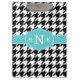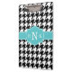 Black and white houndstooth pattern with a seafoam blue stylish quatrefoil triple monogram template. A modern and trendy gift idea for a preppy, stylish sorority girl.