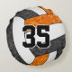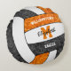 This cute volleyball themed throw pillow features the image of a realistic volleyball that has black, orange and white panels, upon which you can customise the player's name, monogram or varsity letter, team and mascot name on the front and jersey number on the back - the volleyball's black and orange panels are blended with a floral kaleidoscopic pattern for a textured appearance - by katz_d_zynes