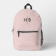 This pastel blush pink design with a black initial monogram backpack is feminine. It's perfect for back to school or anyone.