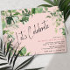 Casual and cute birthday party invitations with a frame of tropical plants. "Let's Celebrate" text in a script font with your event details in the lower right corner. Can be changed to any age. Feminine blush pink colour.