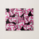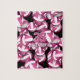 This volleyballs pattern jigsaw puzzle features varied size bright pink and white volleyballs turned every which way on a black background - the volleyballs' non-white panels are accented with an artsy, girly, floral pattern - customise with volleyball player's name and jersey number - by katz_d_zynes