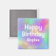 Colourful, personalised Happy Birthday magnet with a unicorn rainbow colour background, gold glitter sparkles confetti, and bold white writing. You can easily add the name of your choice and change the colour and font of the name using the customise option!