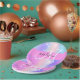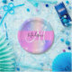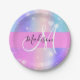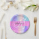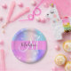 Girly and cute paper plate with a colourful pink, purple, lilac, blue and green unicorn rainbow hearts sparkly background. Your custom name and monogram are written in an elegant hand lettered script with a pink background.