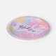 Girly and cute paper plate with a colourful pink, peach, purple, lilac and blue unicorn rainbow hearts sparkly background. Your custom name and monogram are written in an elegant hand lettered script with a lilac purple unicorn paint brush strokes stripe background.