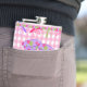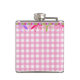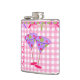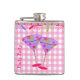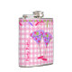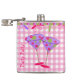 Whimsical lady's flask with graphics of two polka dot colourful martini glasses on a pink and white gingham background. A band of colourful pink, green, and purple flowers decorate around the top of the flask. Pink text is ready to personalise for your favourite party girl or for yourself.