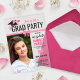 Cute acrylic graduation party invitation with girly pink bows and ribbon details, pink and matte black fonts, and a photo of your graduating daughter. Girly graduation party invitation printed on acrylic with a transparent background and pink details, with a pretty bow and pink tassel on the graduation cap. The perfect acrylic graduation celebration invitation for girly girls of all ages.