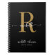 Modern, Chic, Elegant Black and Gold Monogram Initial Name Feminine Signature Script Spiral Notebook. This simple minimalist plain colour design featuring your first name in a pretty hand lettered swash tail font typography (or calligraphy), monogram initial, full name and text line template, easy to personalise them. Great custom personalised girly gift for Birthday Party, Housewarming, Wedding, SWEET 16 Birthday party, Bridal shower, BABY shower, back to school, business, professional and for anyone who loves pretty elegant minimalist style.