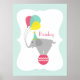 This poster for the nursery features an illustration of an elephant standing on a pink ball wearing a teal hat and holding three balloons in its trunk. Border is light teal. Personalise the name.
