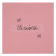 Customisable Name or other words written over each other in shades of pink and blush. The word on the bottom has big letters in very light pink and the word on top is written in handwriting letters with very dark colour. On the upper left and bottom right corner there is a drawing of a small bouquet of flowers to enhance the girly look.