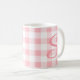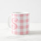 Cute and girly custom mug featuring a pink and white country gingham plaid, topped with an pink monogram initial in script lettering. Shown is the editable monogram letter S. The initial appears on both sides of the mug. Designed by 369MyName.