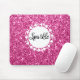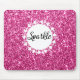 Girly and glam hot pink glitter sparkles mouse pad with the word "Sparkle" in black and a white background with white hearts.