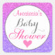 Girly and glam ombre purple glitter sparkles princess Baby Shower square sticker with hot pink and grey writing. You can easily add the name of your choice and change the colour and font using the customise option!